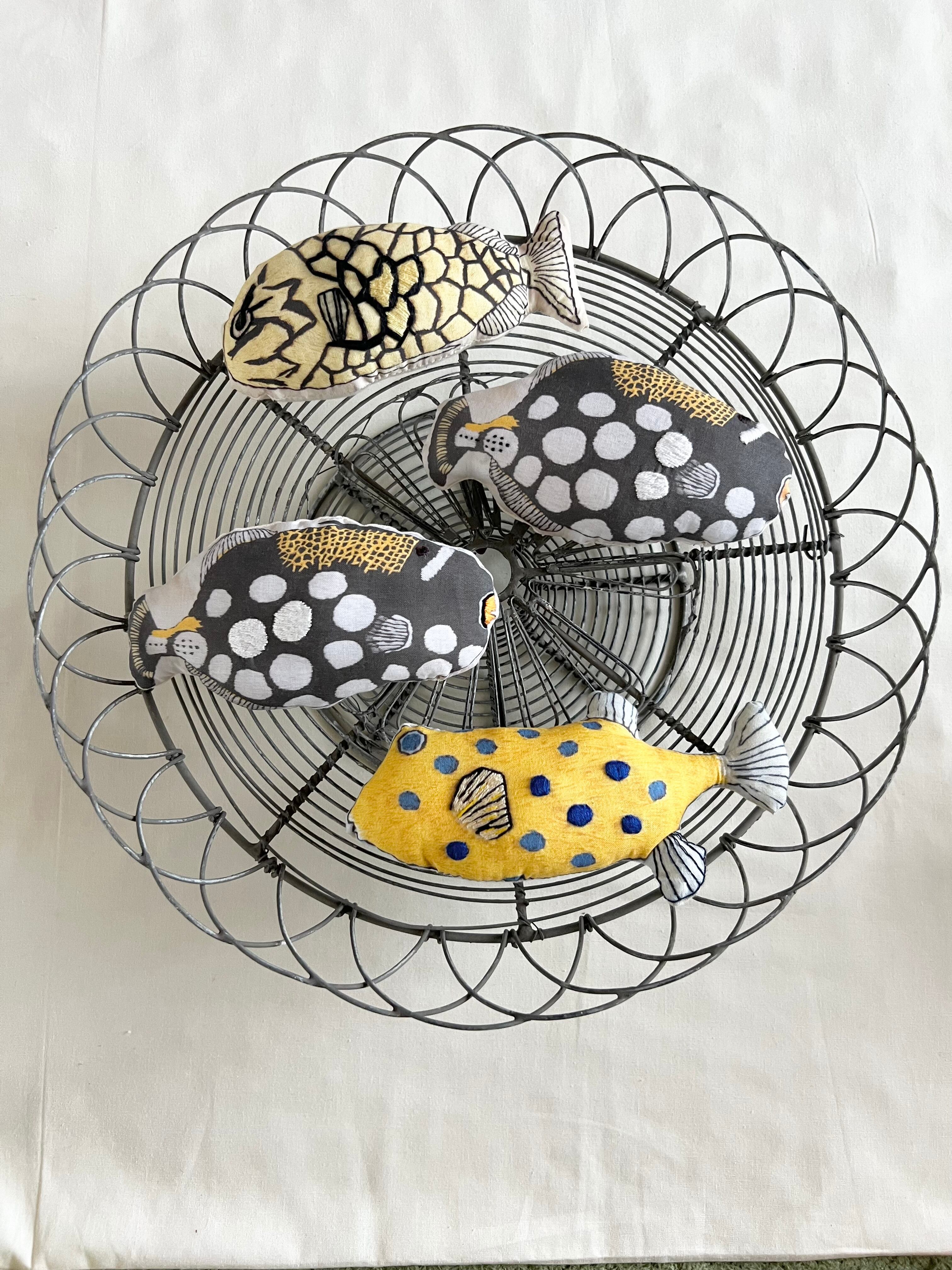 刺繍した原画をプリントした布に、また部分的に刺繍をして、布の置き物に仕立てました。